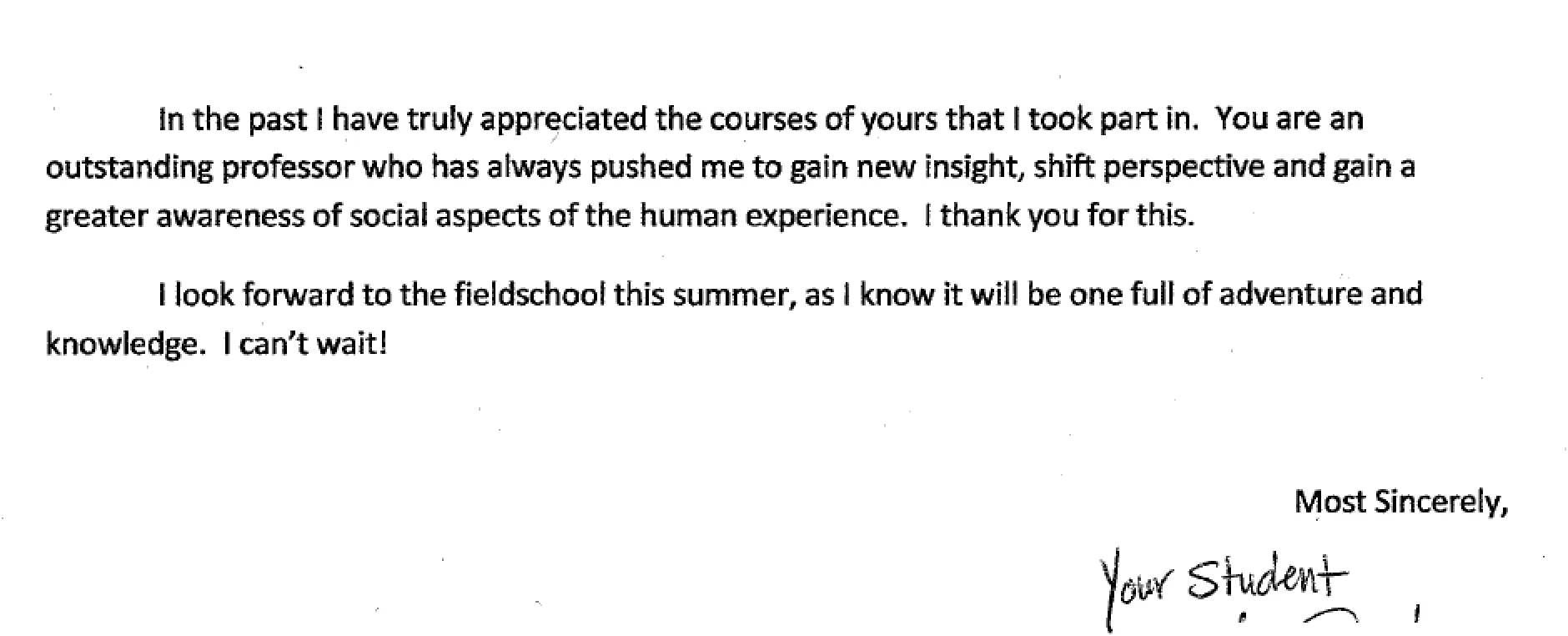 Hello, Dr. Thiessen, Thank you for a very stimulating semester. I feel you've opened my eyes to some new perspectives and have helped me on my way to becoming a more well-rounded and tolerant person, if not an anthropologist. I really loved your lectures. [...] Thank you again for a great class!